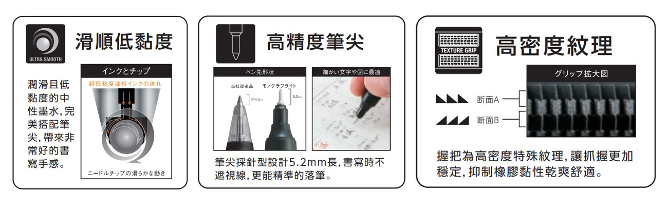 調整了常見的筆尖長度,書寫時的視野更廣,可以清楚看見正在書寫的內容。